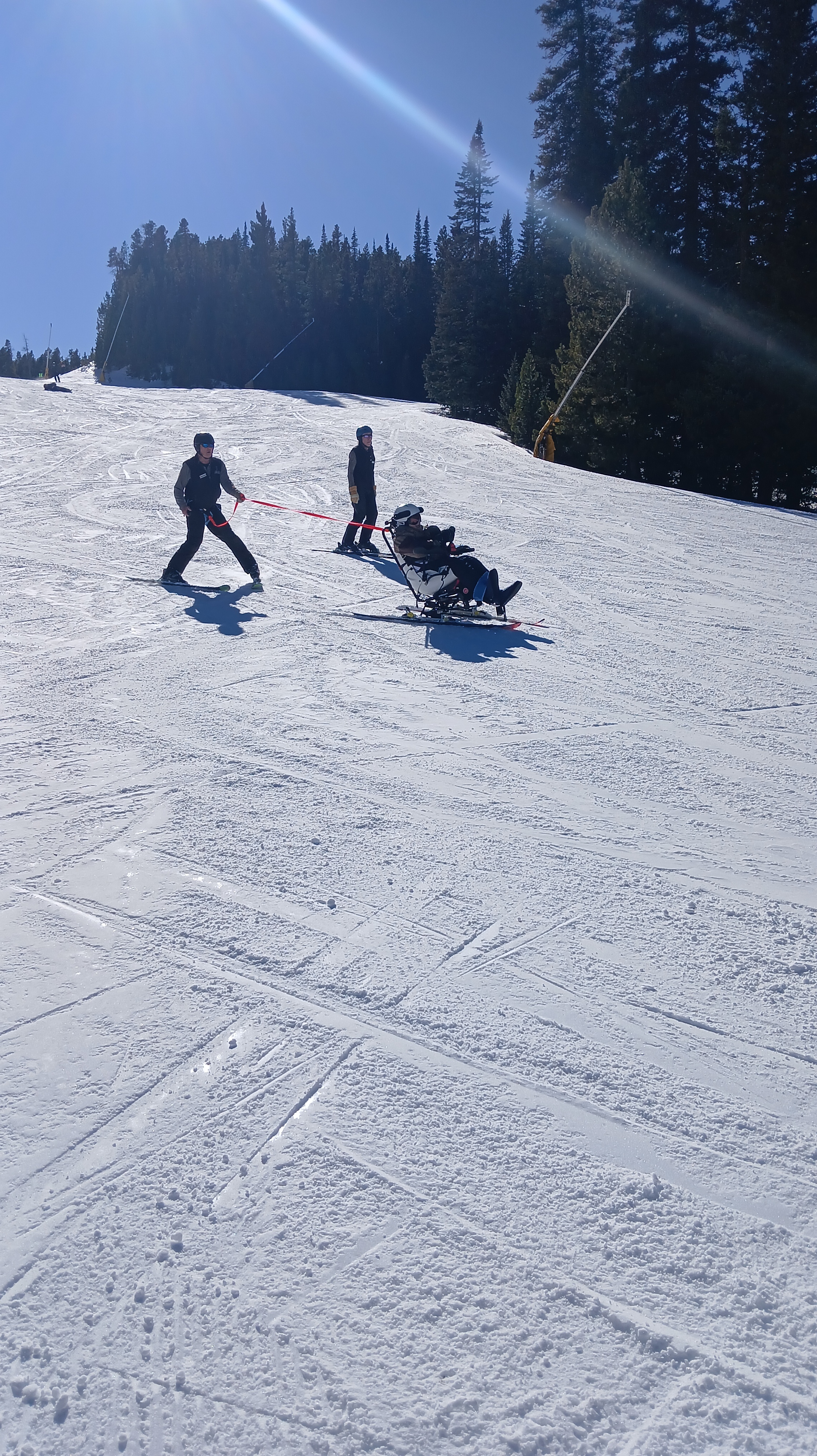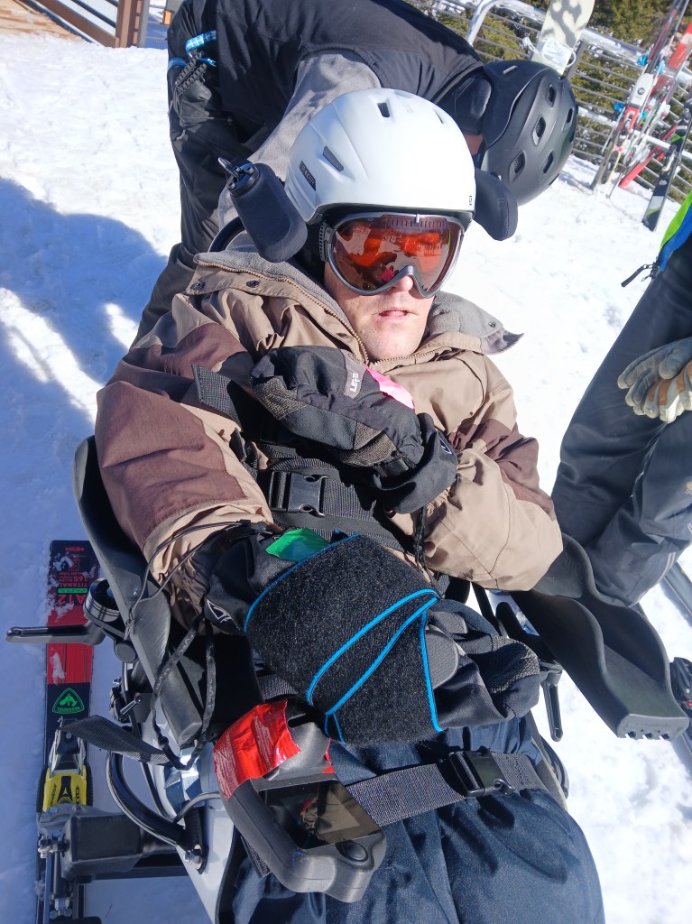 Once at Eldora, we are met by a Crew of Ignite staff and volunteers ready to help Nick into the Ski, they have a new ski, the tetra that Nick can control left and right movements, of course there is someone overseeing his decisions, just incase. Nick is so excited to still be able to ski, it is one of the few passions he has held on to. Nick says “The men are awesome!” and “I like the music.”